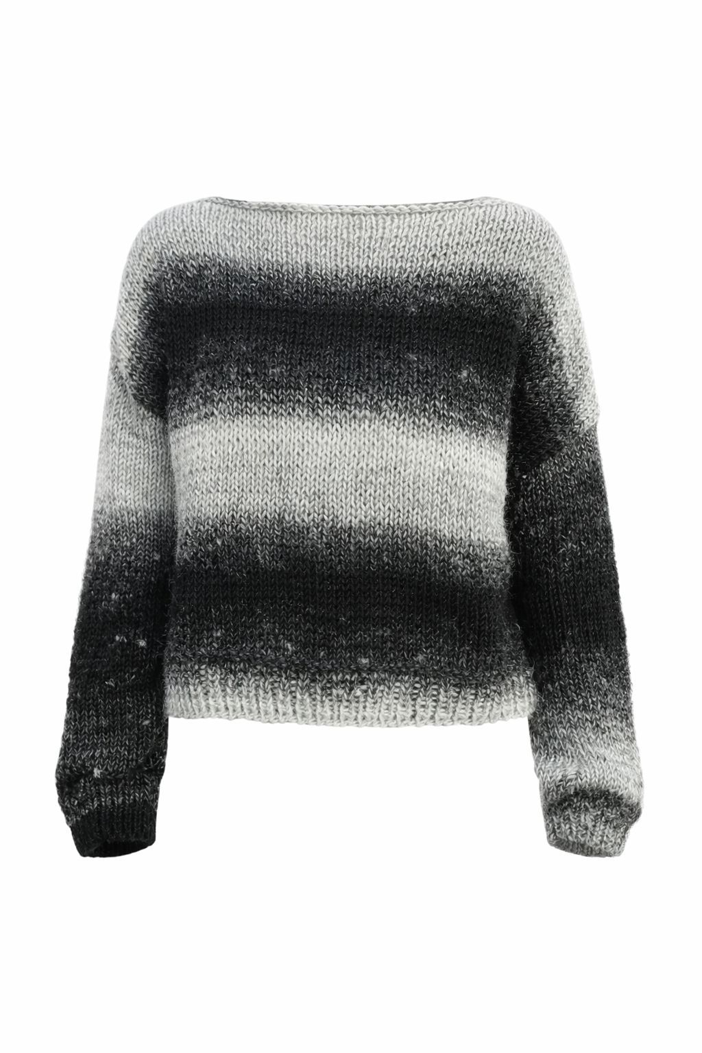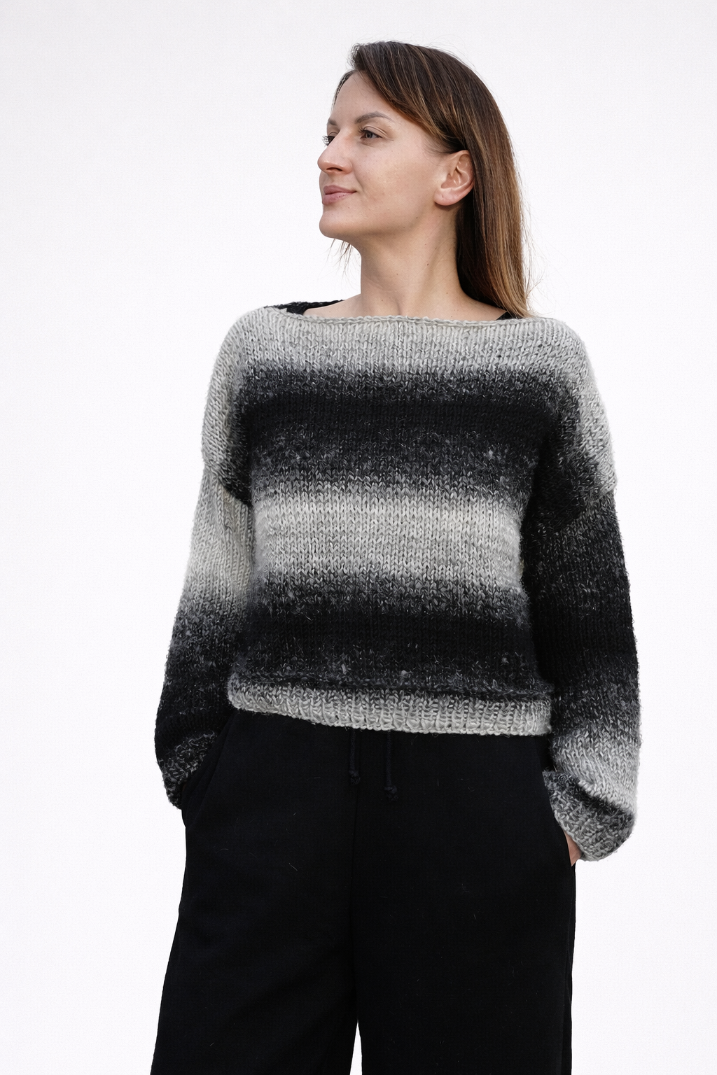 Przy tym kroju linia szwu ramienia naturalnie opada poniżej ramienia, co nadaje swetrowi luźny, komfortowy charakter.